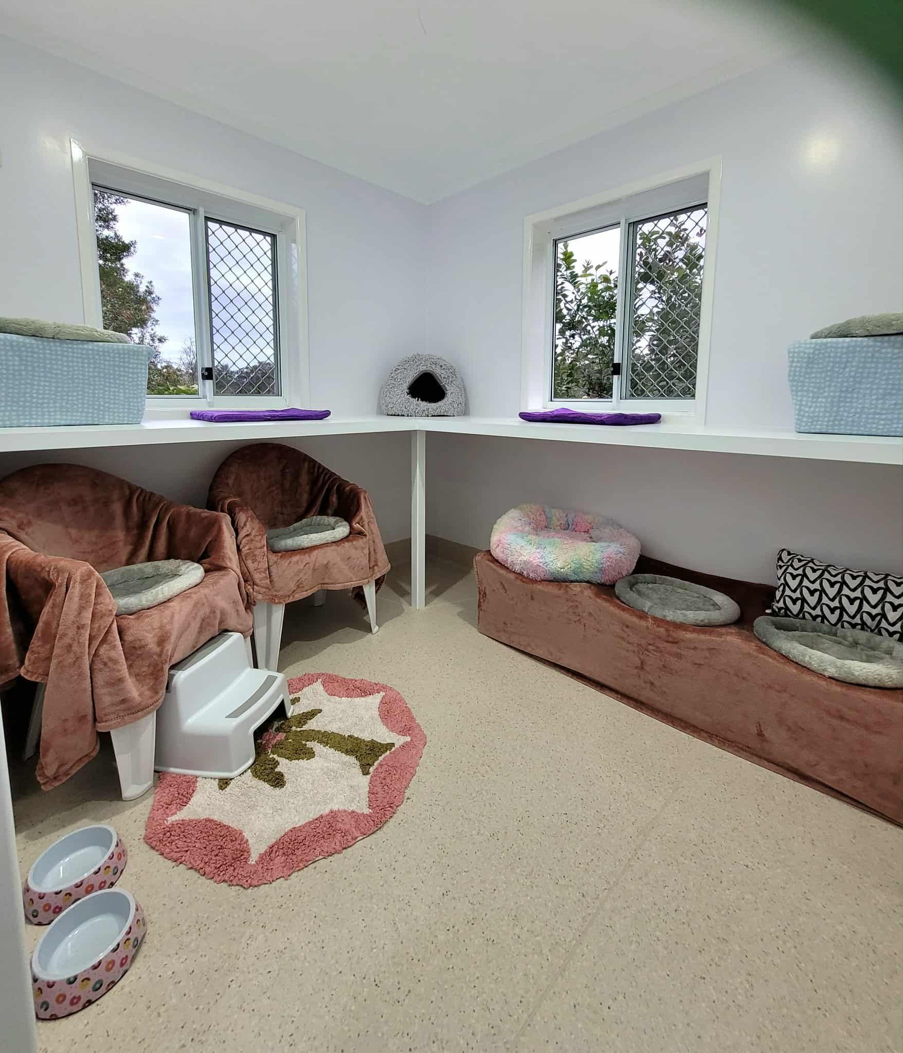 Our Premium Boutique rooms are a refined upgrade from our standard Boutique accommodation, offering a more spacious layout, additional bench space, and two generous windows. These elevated features provide a light-filled environment with picturesque views across the grounds, treetops, and visiting birdlife — a truly tranquil and enriching experience for your cat.