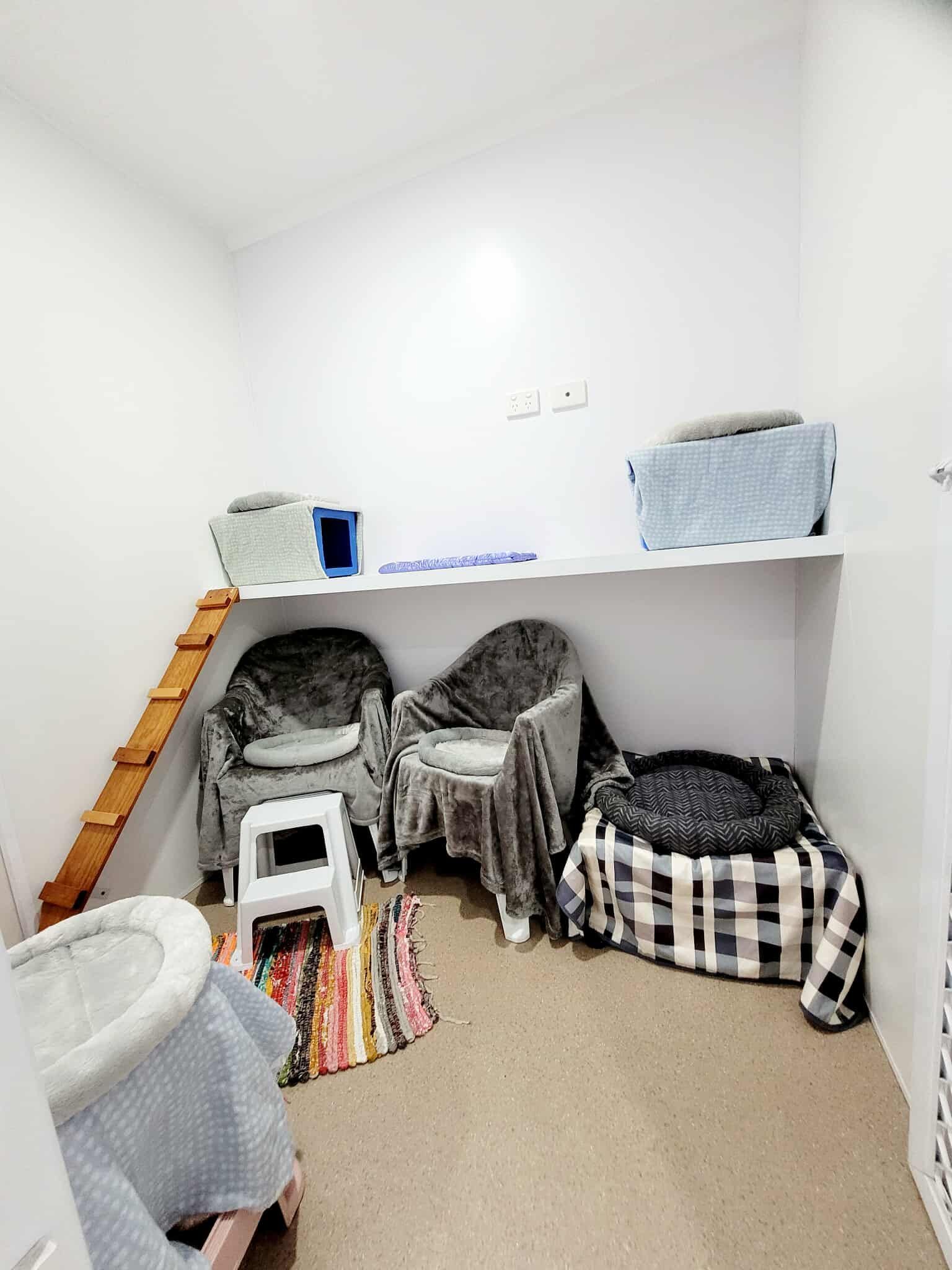 Each room is approximately 2x2m wide and 2.4m high, providing safe, enclosed space where cats can relax at their own pace.